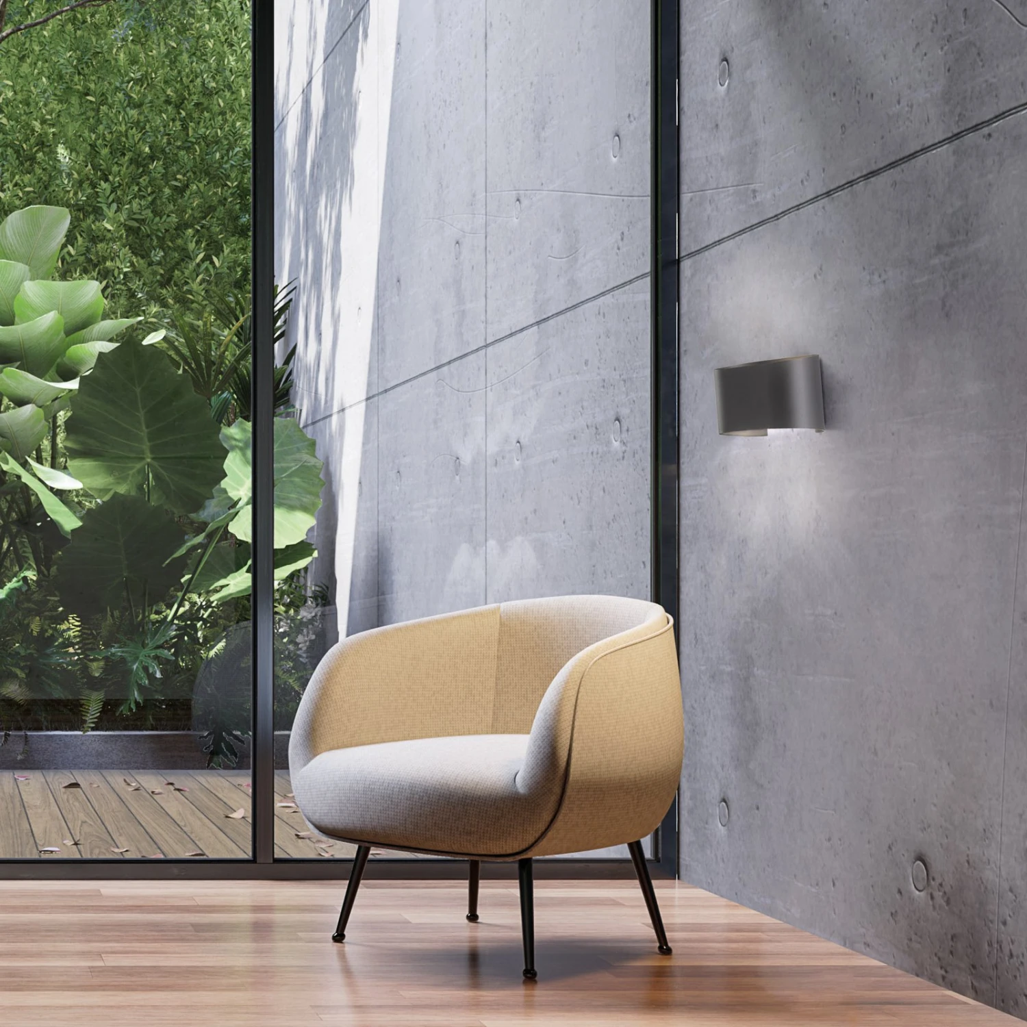 Debido al diseño curvo, el aplique de pared puede combinarse sin esfuerzo con los estilos de mobiliario moderno. Está equipado con LEDs de color blanco cálido y la luz escapa tanto hacia arriba como hacia abajo, por lo que la emisión de luz es variable y puede ser ajustada si es necesario. Esto crea un hermoso juego de luz en la pared, que parece muy efectivo y crea una gran atmósfera de iluminación. La pared es una lámpara de pared a prueba de salpicaduras y por lo tanto también es adecuada para habitaciones húmedas. Gracias al grado de protección IP44, la luminaria puede utilizarse también en zonas exteriores cubiertas para resaltar atmosféricamente las fachadas de las paredes y para iluminar con seguridad los caminos.