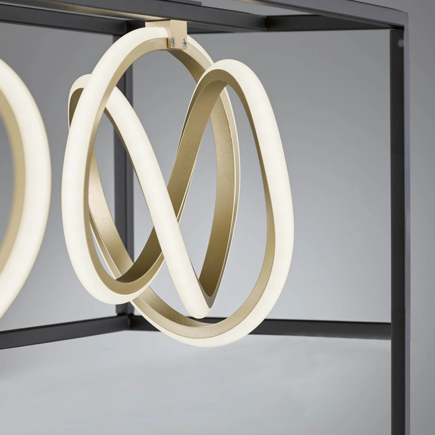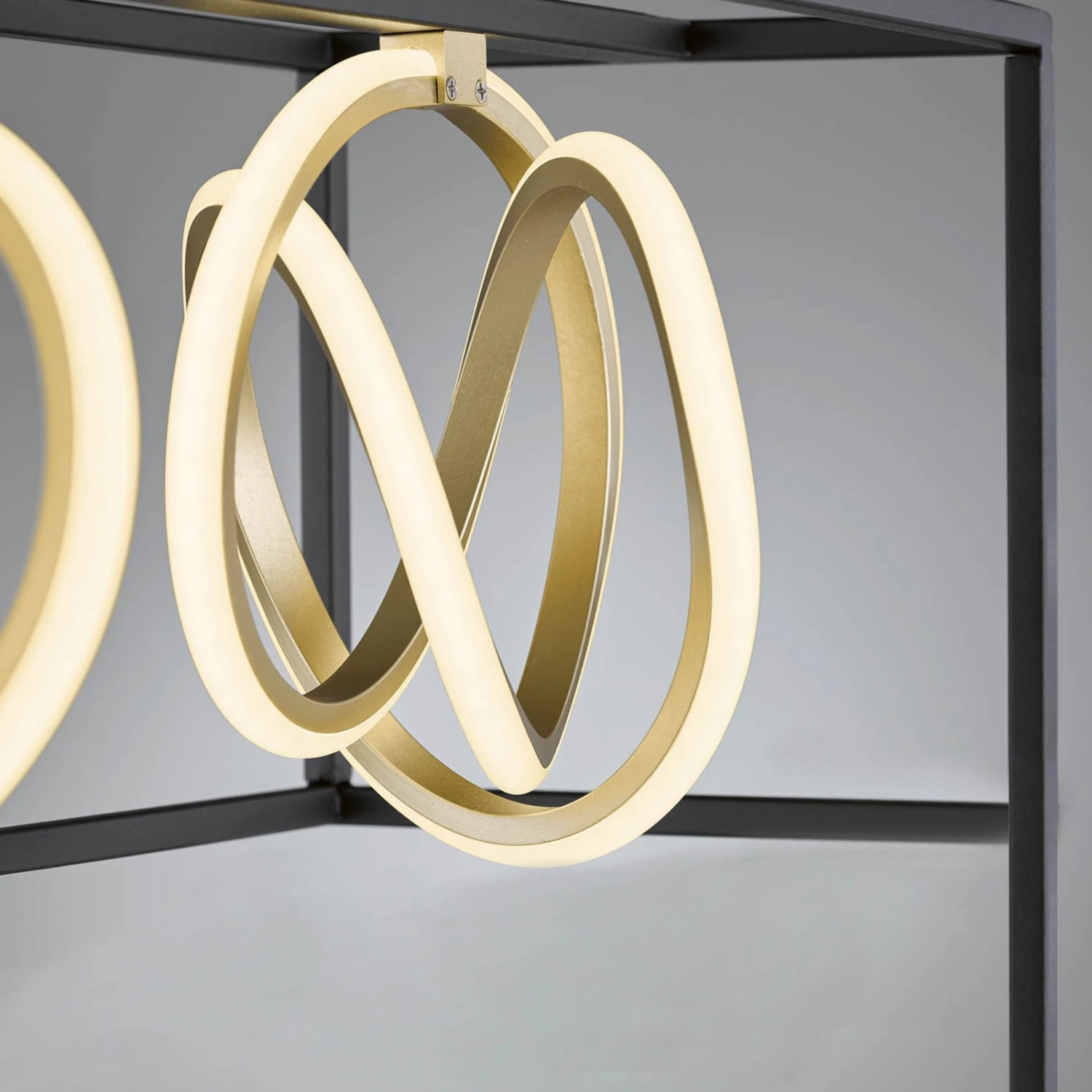 Lámpara colgante LED regulable Gisi con color de luz ajustableEquipada con un mando a distancia y un aspecto muy individual, la lámpara colgante Gisi convence en toda su línea. Un marco angular y delgado de metal negro rodea las cuatro fuentes de luz, que tienen forma de espiral. Sus trayectorias curvas están coloreadas en oro. La luz de los LED se emite de forma homogénea en todas las direcciones a través de las pantallas de plástico blanco. Con la ayuda del mando a distancia, la luminosidad se puede ajustar de forma gradual, lo que permite adaptarla de forma ideal a las condiciones de iluminación. Además, Gisi tiene la opción de controlar la luz blanca. A través del mando a distancia, se pueden obtener diferentes colores de luz, desde el blanco cálido hasta la luz diurna.