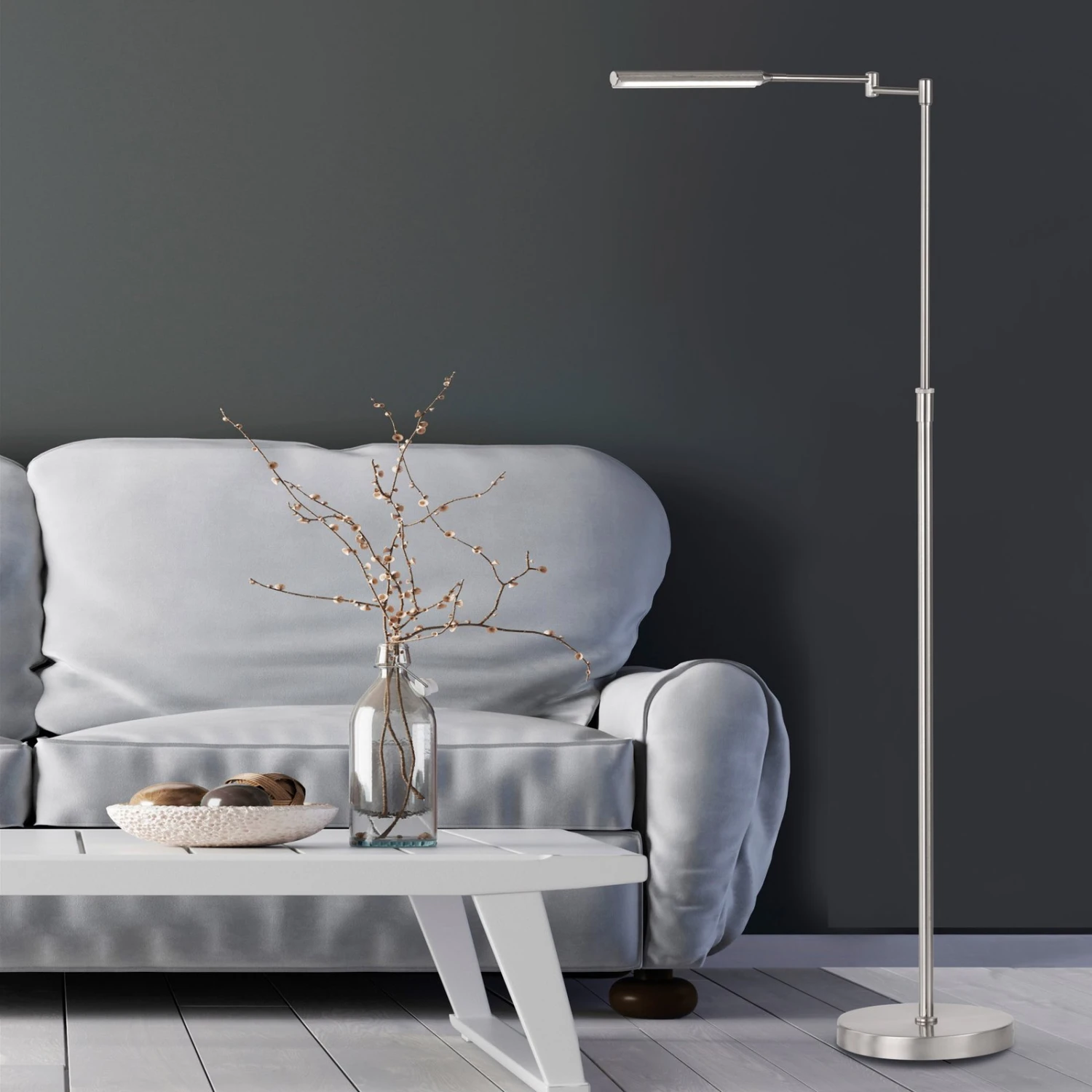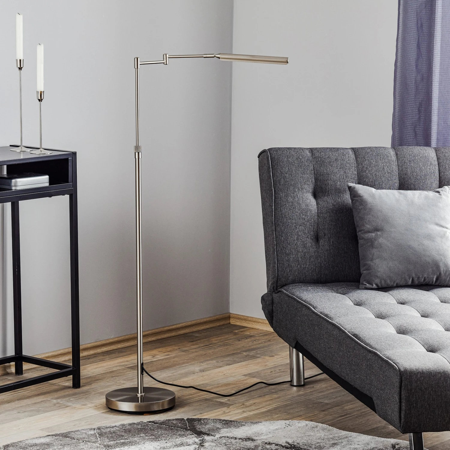 Con su diseño clásico, la lámpara de suelo Nami LED de metal de color níquel encaja en cualquier interior moderno, elegante, con estilo y absolutamente intemporal. El práctico atenuador de pie simplifica enormemente la operación, porque el brillo puede ser atenuado continuamente. Además, la lámpara de pie tiene la función de cambio de color Blanco Sintonizable para cambiar el color de la luz en tres pasos. El armazón está equipado con otra característica especial: es ajustable en altura y permite una altura variable de toda la lámpara de 90 a 130 cm. La dirección de la luz también es flexible en todo momento gracias a la cabeza de la luminaria giratoria. La lámpara de pie Nami es, por lo tanto, extremadamente versátil en la sala de estar.