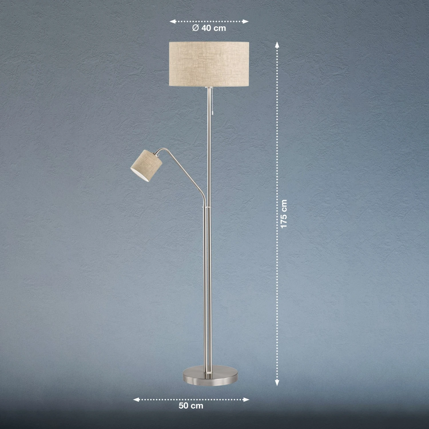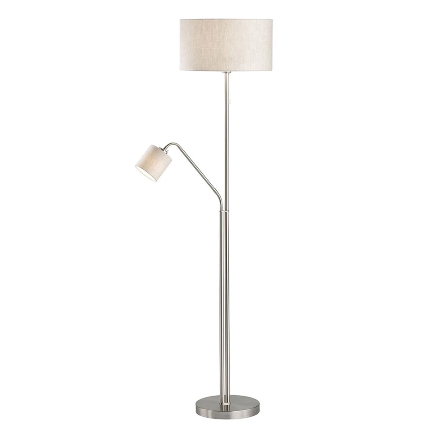 Cómoda lámpara de pie Layer con lámpara de lectura integrada, pantalla en forma de cilindroModerna, acogedora y, al mismo tiempo, de belleza atemporal es el efecto de la lámpara de pie Layer con su característica combinación de materiales y formas. La estructura metálica tiene un acabado níquel mate y se complementa con dos pantallas de tela en forma de cilindro. Estas últimas albergan casquillos conmutables por separado, de modo que existen tres variantes de iluminación: luz principal para una iluminación adicional atmosférica en la zona de asientos del salón, sólo luz de lectura o ambas a la vez